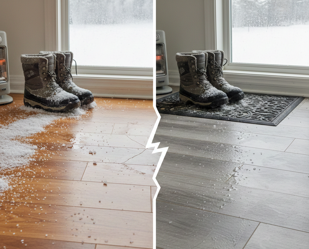 Snow and salt can sit on vinyl without damage, but laminate requires fast cleaning to avoid swelling. This difference is critical when evaluating laminate vs vinyl flooring Canada for winter-heavy homes.